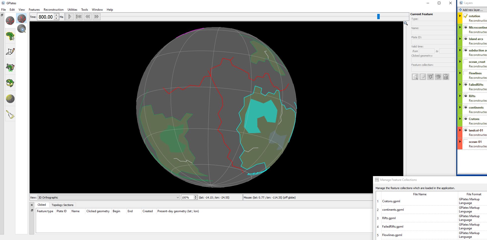 This happened because GPlates reads things back to front so it was counting the co-ordinates as where it thought the crust should be when it stopped following craton A, not where they were at the time that it did stop following craton A… So I went back and spent 5 minutes looking at notepad++ and figured out my problem and swapped the things around, reloaded the rotation file. It worked, one part of the plate was doing what I wanted it to do. Hell yeah, learning, baby! Accomplishment! Endorphins! Dopamine!