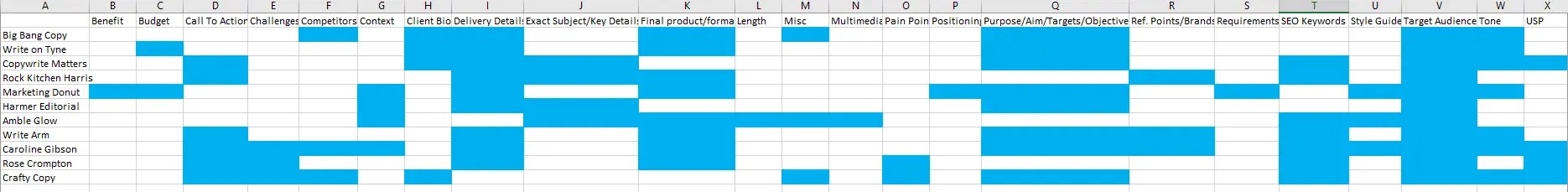 - Delivery details: Anything that isn’t directly about the words themselves – general business details, contact details, industry, existing material, etc.