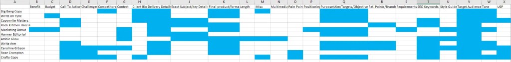 This is by no means a comprehensive study, consisting of a whole eleven sources, but as an intro and an interesting insight into the broader thinking, it’s interesting. Its also worth noting that I’ve fudged some of the entries here as everyone has their own phrasing and formats etc. To avoid having a hundred cells with one entry, I’ve homogenised some of the cells.