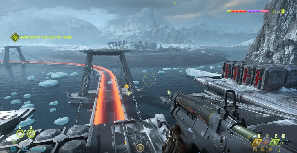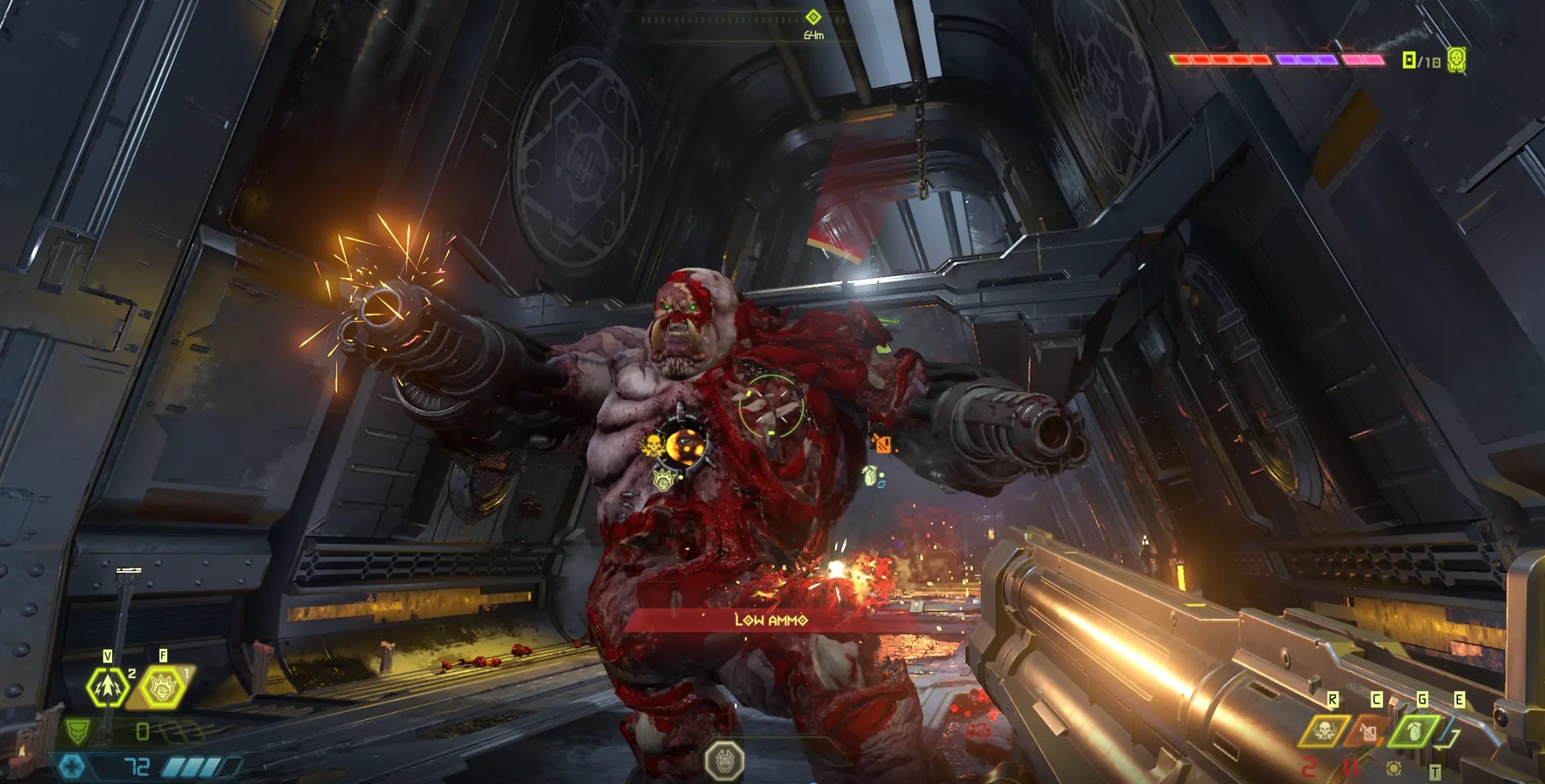 A similar problem comes up with the platforming. There’s a lot of it in Eternal. To be fair, Eternal has managed to make the movement feel very fluid – there’s less sense of the usual FPS platforming jank, which is a relief while flinging yourself into the air from a monkey bar and shotgunning a revenant in the face as you sail past. That said, I didn’t get on with the jumping puzzles between encounters. I think primarily because of the dash ability. If you’re going to put dash into an FPS, it is Unreal Tournament style – double tap a direction. No exceptions. Doom Eternal wants it bound to a specific key. This is a bad decision.